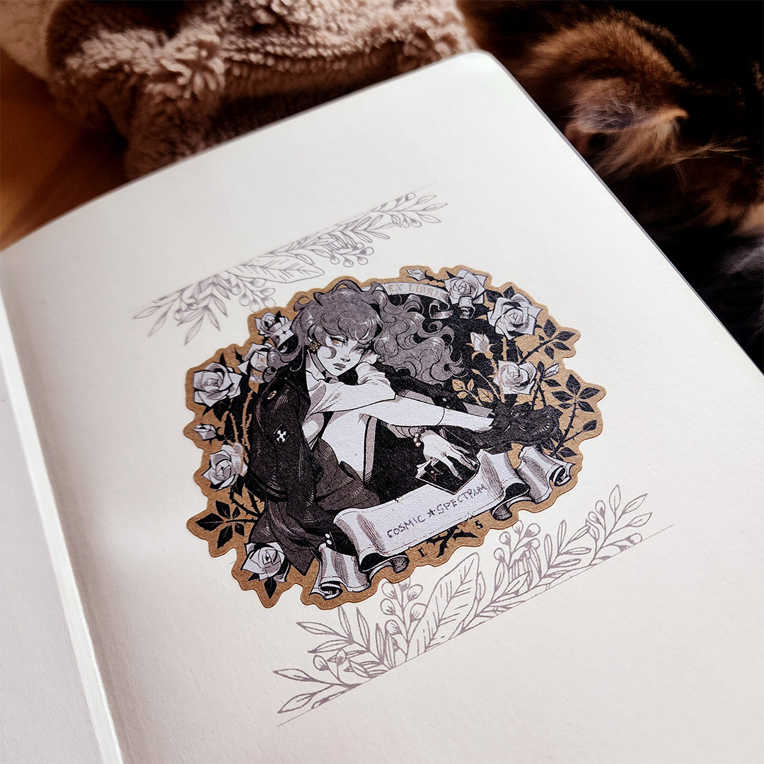 A vintage bookplate sticker design created for my sketch collection Artbook Halcyon Days featuring Noelle! This is a high quality craft paper sticker printed with white ink, creating a unique contrast between the art and the sticker material.